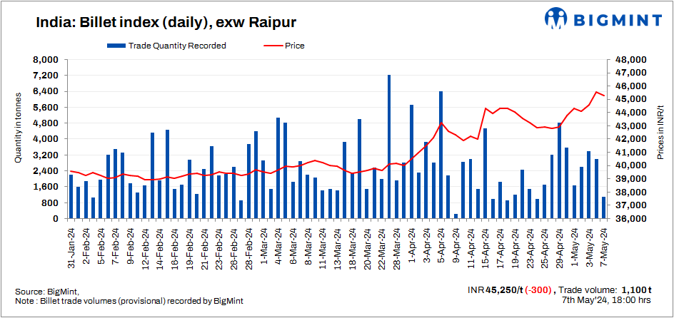 BigMint’s billet index dropped INR 300/t to INR 45,250/t exw-Raipur on 7 May, 2024.
