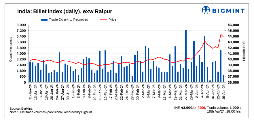 BigMint’s billet index dropped INR 400/t to INR 43,900/t exw Raipur as on 16 April, 2024.