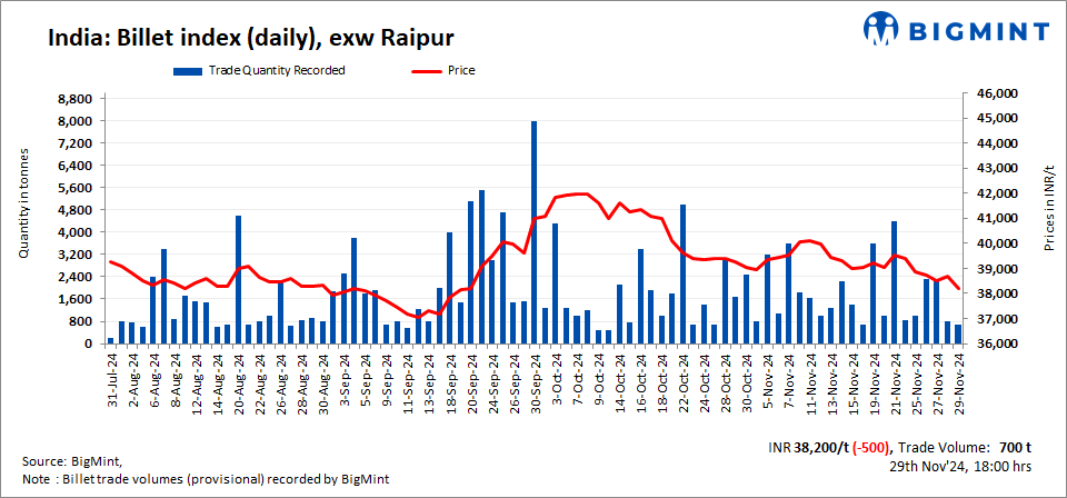BigMint’s billet index dipped INR 500/t d-o-d to INR 38,200/t exw Raipur on 29 November, 2024.