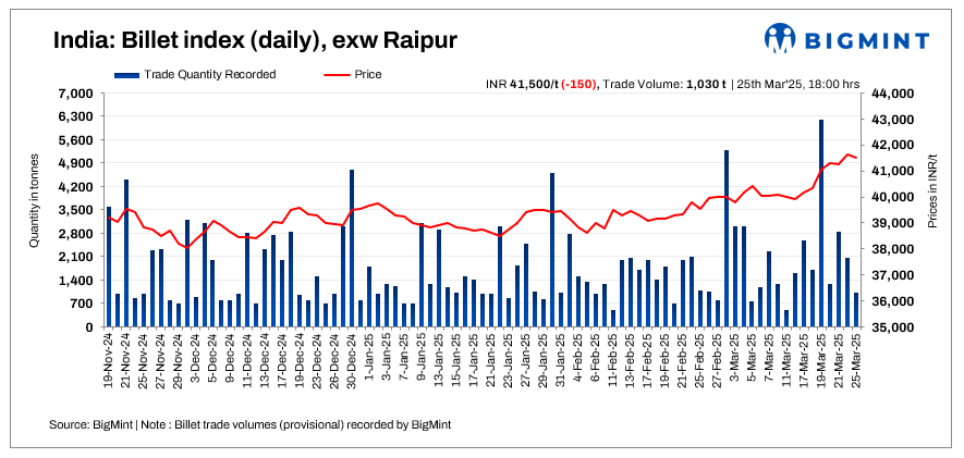 BigMint’s billet index fell slightly by INR 150/t, reaching INR 41,500/t exw-Raipur on 25 March 2025.