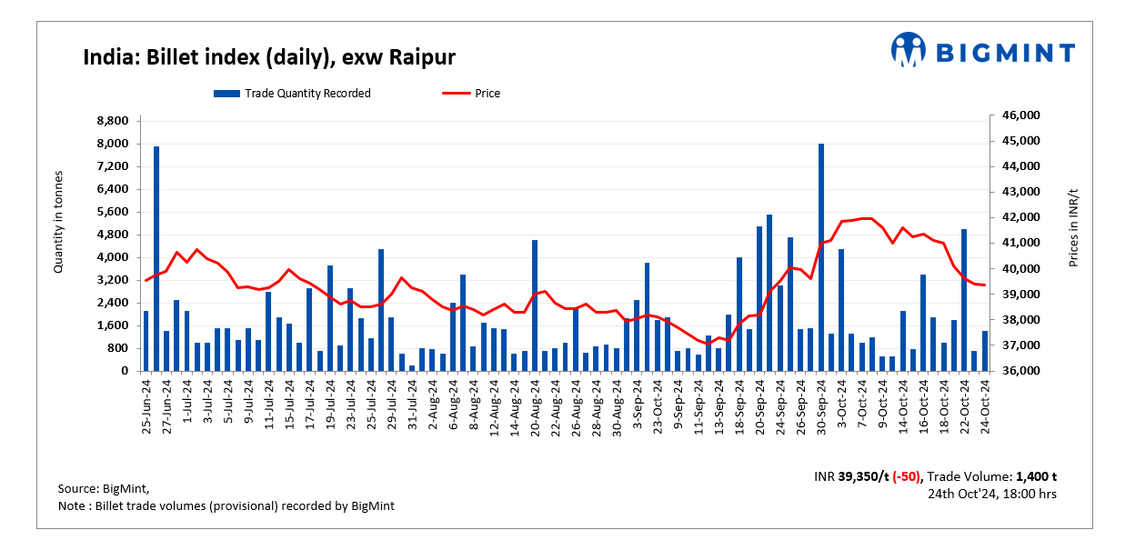BigMint’s billet index edged lower by INR 50/t, settling at INR 39,350/tonne (t) exw-Raipur on 24 October, 2024.