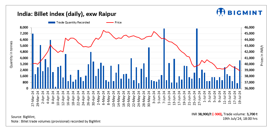 BigMint’s billet index declined further by INR 300/t, reaching INR 38,900/t exw-Raipur on 19 July, 2024.