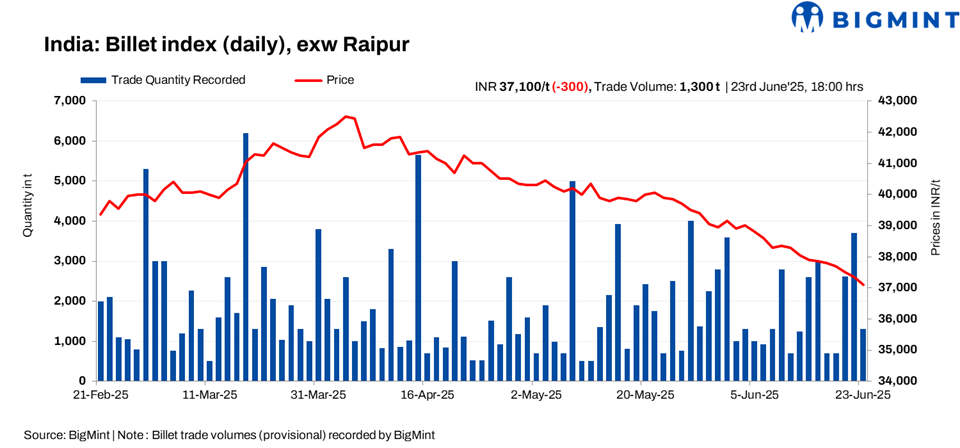 BigMint’s billet index slumped further by INR 300/tonne (t) d-o-d to INR 37,100/t exw-Raipur on 23 June 2025 – its lowest in over four years, and last seen in February 2021.