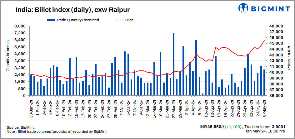 BigMint’s billet index hit a new high for this year on 6 May, reaching INR 45,550/tonne (t) exw-Raipur.
