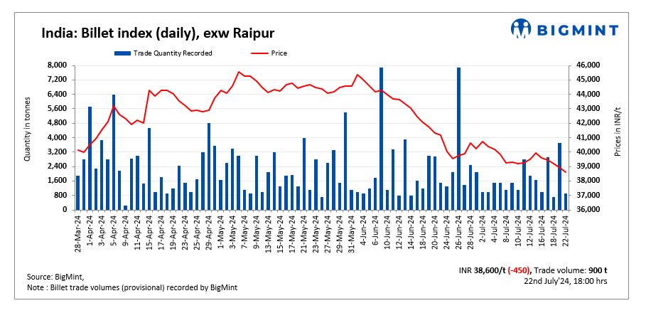 BigMint’s billet index continued to decline further by INR 450/t, reaching INR 38,600/t exw-Raipur on 22 July, 2024.