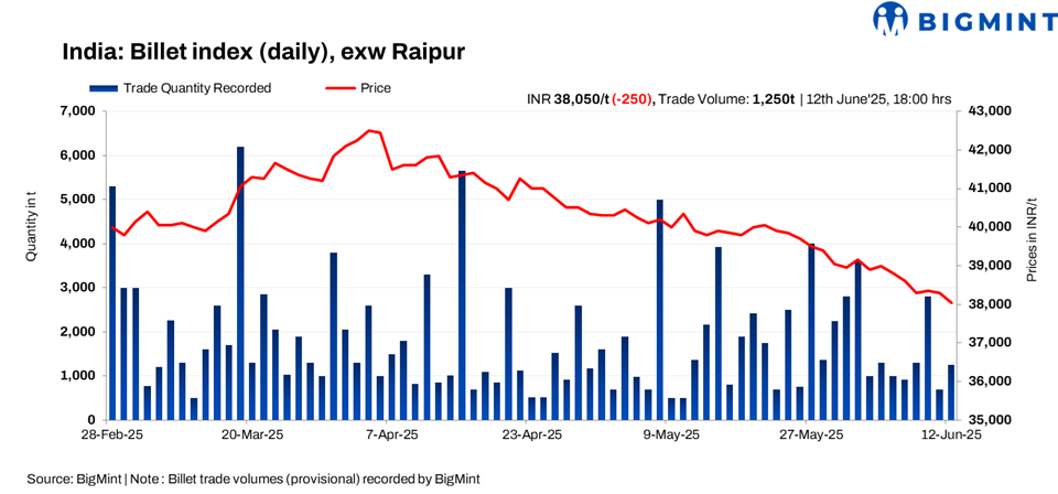 BigMint’s billet index dropped further by INR 250/tonne (t) d-o-d to INR 38,050/t exw-Raipur on 12 June 2025, marking a six-month low. Despite reduced offers, buying activity remained modest, with demand still falling short of expectations.
