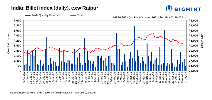 BigMint’s billet index remained unchanged d-o-d (d-o-d) at INR 40,300/tonne (t) exw-Raipur on 2 May 2025.