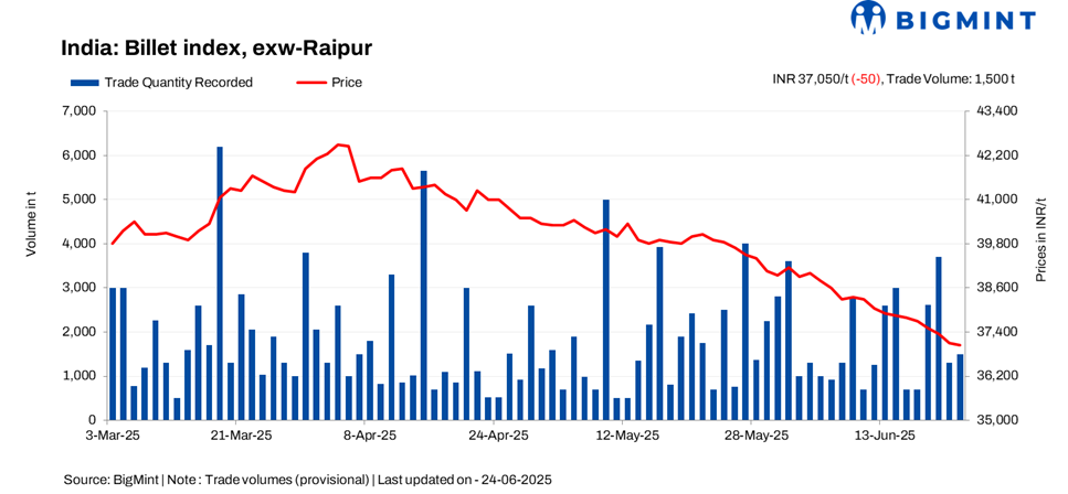 BigMint’s billet index edged down by INR 50/tonne (t) d-o-d, settling at INR 37,050/t exw-Raipur on 24 June 2025, as the market observed modest buying activity amid largely range-bound sentiments.