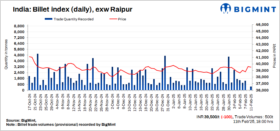 BigMint’s billet index falls by INR 100/t to INR 39,450/t exw-Raipur on 11 February, 2025.