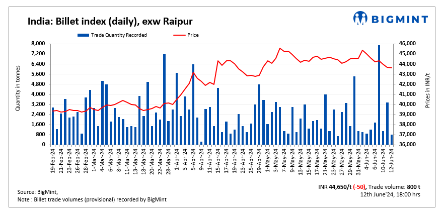 BigMint’s billet index fell slightly by INR 50/t to INR 43,650/t exw-Raipur on 12 June, 2024.