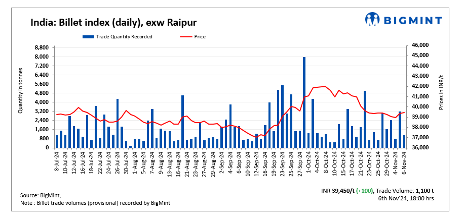 BigMint’s billet index rose slightly by INR 100/t, reaching INR 39,450/tonne (t) exw-Raipur on 6 November 2024.