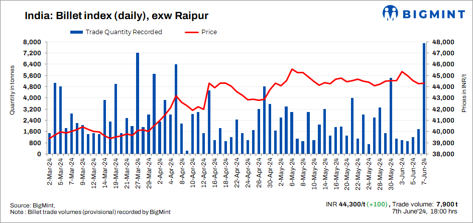 BigMint’s billet index inched up by INR 100/tonne (t) to INR 44,300/t exw Raipur on 7 June, 2024.