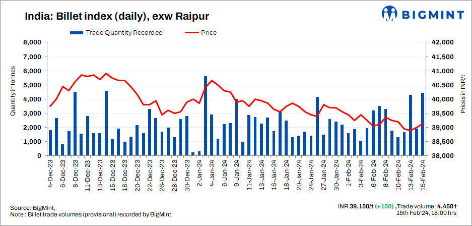 BigMint’s billet index inched up by INR 150/t to INR 39,150/t exw-Raipur on 15 February, 2024.
