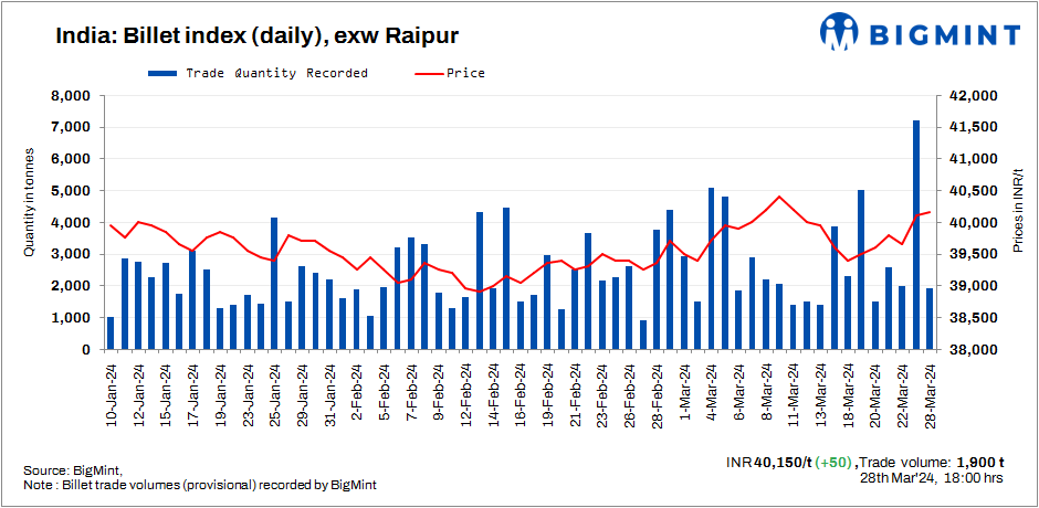BigMint’s billet index inched up by INR 50/t to INR 40,150/t exw Raipur on 28 March, 2024.