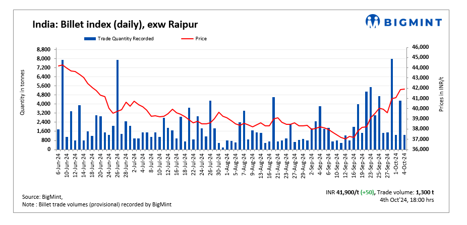 BigMint’s billet index inched up by INR 50/tonne (t) to INR 41,900/t exw-Raipur as on 4 October 2024.