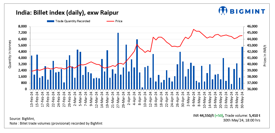 BigMint’s billet index rose slightly by INR 50/tonne (t) to INR 44,550/t exw-Raipur on 30 May, 2024.