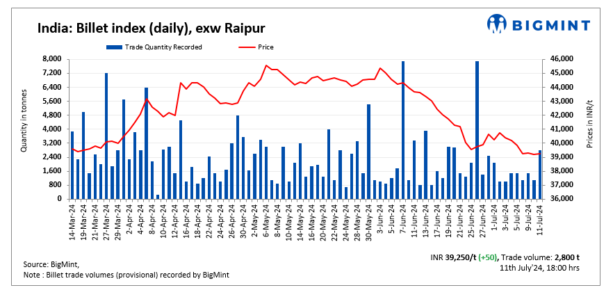 BigMint’s billet index inched up by INR 50/t, reaching INR 39,250/t exw-Raipur on 11 July, 2024.