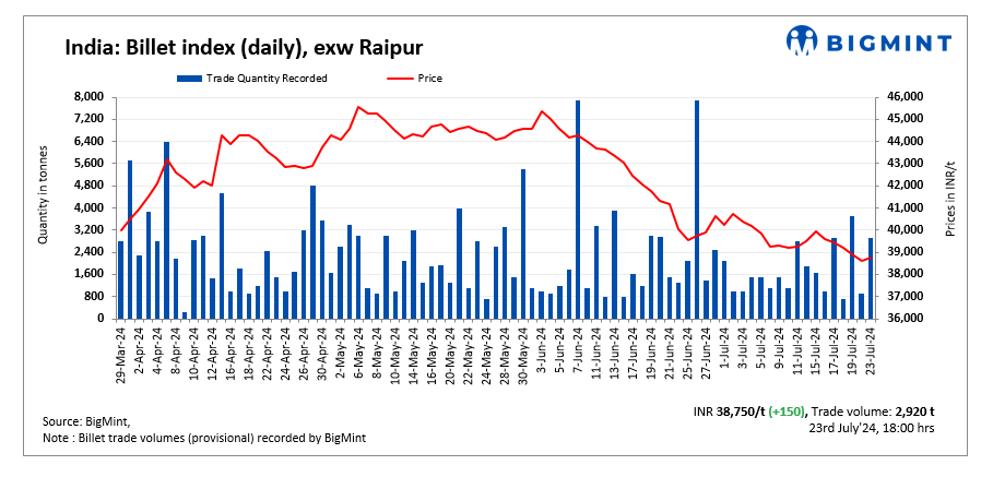 BigMint’s billet index has risen by INR 150/tonne (t), reaching INR 38,750/t exw-Raipur on 23 July, 2024.