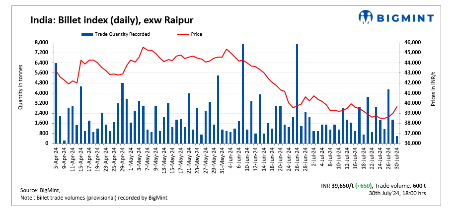 BigMint’s billet index has increased by INR 650/tonne (t), reaching INR 39,650/t exw-Raipur on 30 July, 2024.