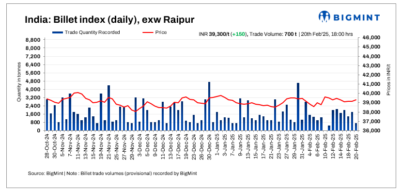 BigMint’s billet index rose slightly by INR 150/tonne (t) today, to INR 39,250/t exw-Raipur on 20 February 2025.