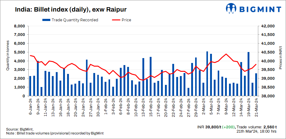 BigMint’s billet index increased by INR 200/t to INR 39,800/t exw -Raipur on 21 March, 2024.