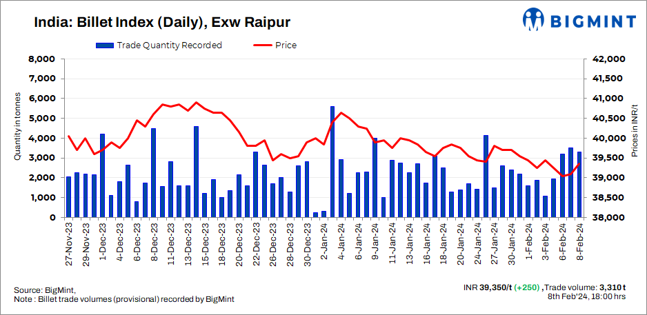 BigMint’s billet index continued to rise by INR 250/t to INR 39,350/t exw-Raipur on 8 February, 2024.