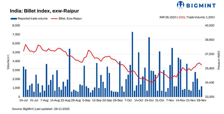 BigMint’s billet index dropped by INR 200/tonne (t) d-o-d to INR 34,900/t exw-Raipur on 28 November 2025. The decline came as buying interest remained muted despite lower offers, with sentiment weighed down by subdued inquiries and weak market cues from neighbouring regions.
