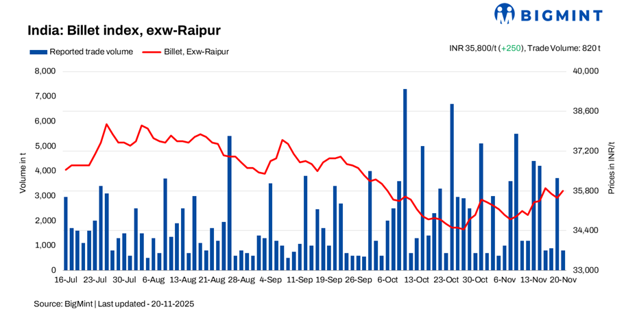 BigMint’s billet index recovered by INR 250/t d-o-d, settling at INR 35,800/t exw-Raipur on 20 November 2025. The price rise was supported by a significant improvement in bids in yesterday’s Odisha Mining Corporation (OMC) iron ore auction and positive influence from northern markets.