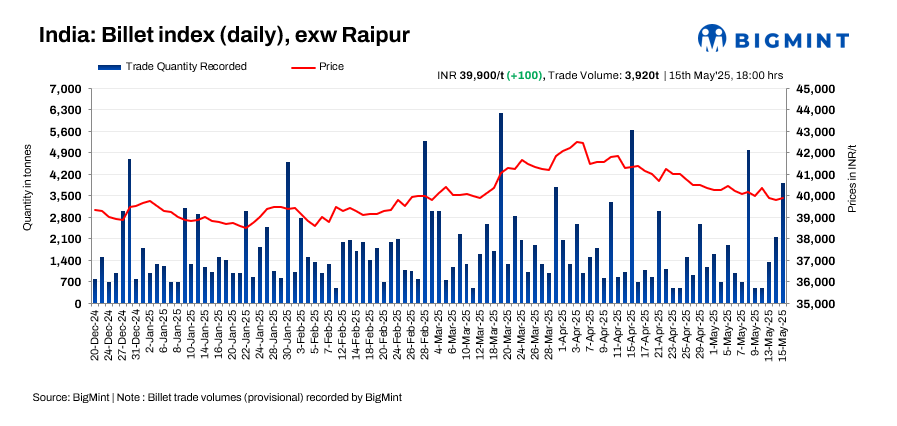 BigMint’s daily billet index recorded a marginal recovery of INR 100/tonne (t) d-o-d, settling at INR 39,900/t exw-Raipur on 15 May 2025, supported by renewed buying interest in the spot market.
