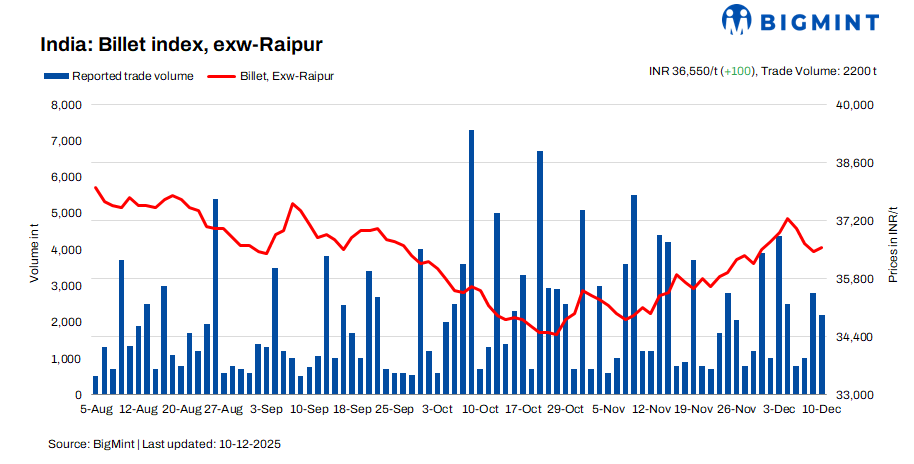 BigMint’s billet index posted a modest gain of INR 100/tonne (t) day-on-day (d-o-d), settling at INR 36,550/t exw-Raipur on 10 December. The uptick was supported by early signs of demand recovery in the semi-finished steel segment.