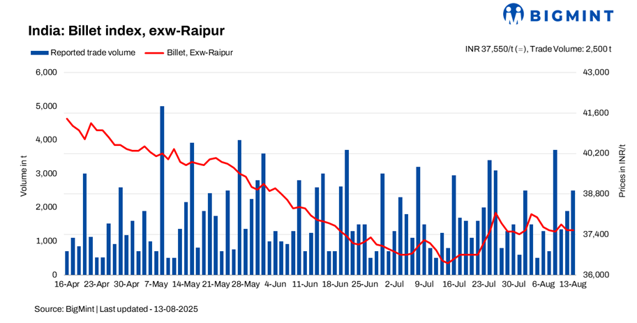 BigMint’s billet index remained steady d-o-d at INR 37,550/tonne (t) exw-Raipur on 13 August 2025, amid modest buying activity and overall cautious market sentiments.