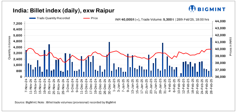 BigMint’s billet index remained firm today at INR 40,000/tonne (t) exw-Raipur on 28 February 2025.