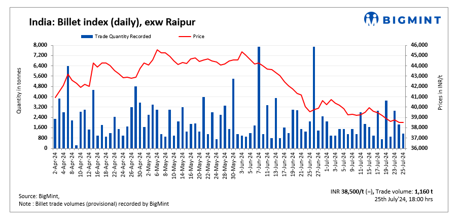 BigMint’s billet index remained stable today at INR 38,500/tonne (t) exw-Raipur on 25 July, 2024.