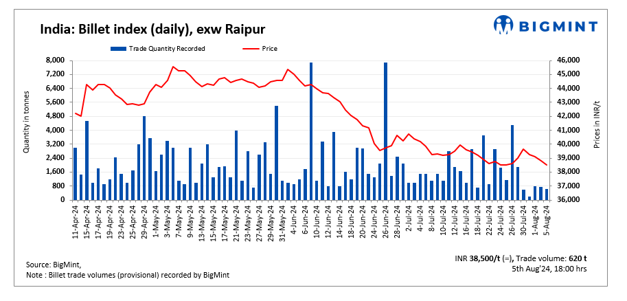 BigMint’s billet index remained stable at INR 38,500/t exw Raipur on 5 August, 2024.