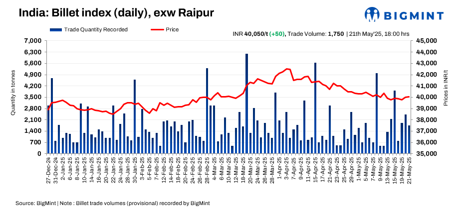 BigMint’s billet index stayed largely range-bound with a marginal rise d-o-d, settling at INR 40,050/tonne (t) exw-Raipur on 21 May 2025.