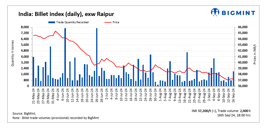 BigMint’s billet index remained stable at INR 37,200/tonne (t) exw-Raipur on 16 September 2024.