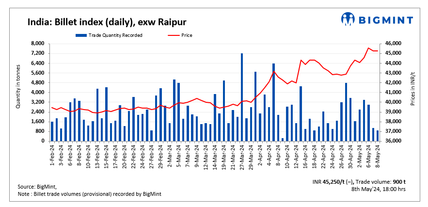BigMint’s billet index stayed stable at INR 45,250/t exw-Raipur on 8 May, 2024.