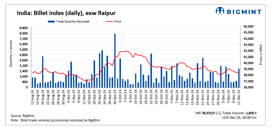 BigMint’s billet index remained firm at INR 38,450/tonne (t) exw-Raipur on 11 December 2024.