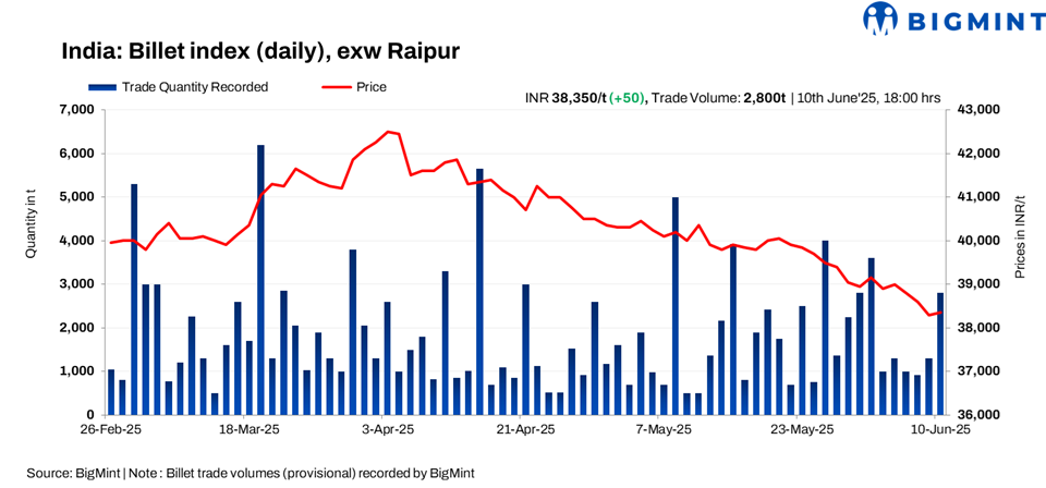 BigMint’s billet index stayed largely range-bound with a marginal rise of INR 50/t d-o-d, settling at INR 38,350/tonne (t) exw-Raipur on 10 June 2025.