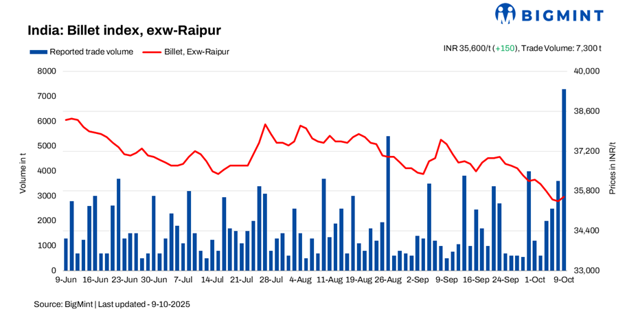 BigMint’s billet index gained by INR 150/tonne (t) d-o-d to INR 35,600/t exw-Raipur on 9 October 2025, supported by a slight uptick in buying activity, signalling a modest recovery in the semi-finished steel market.