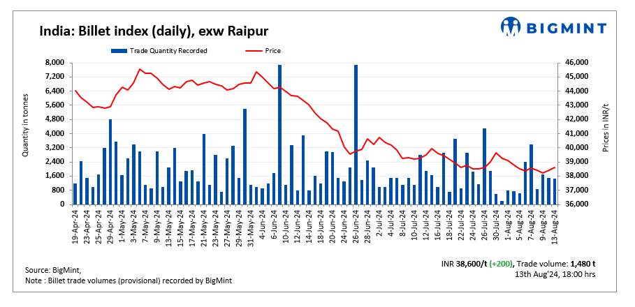 BigMint’s billet index rose further by INR 200/t reaching INR 38,600/t exw-Raipur on 13 August 2024.