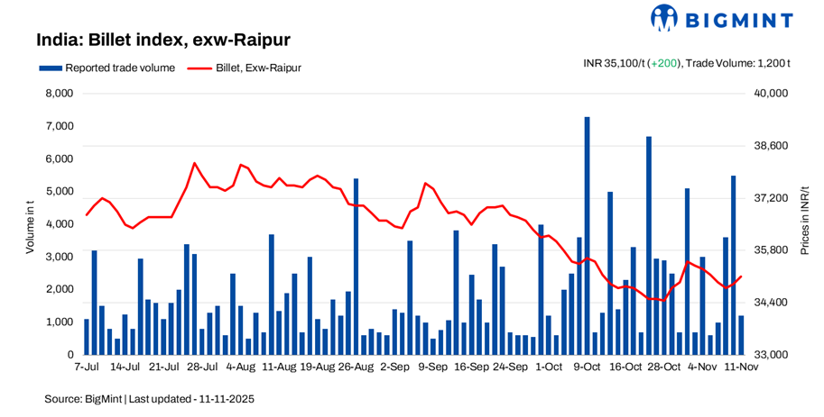 BigMint’s billet index extended its upward trajectory, increasing by INR 200/tonne (t) d-o-d to INR 35,100/t exw-Raipur on 11 November 2025, despite selective trade activity and cautious market participation.
