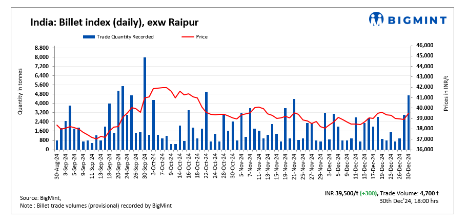 BigMint’s billet index increased further by INR 300/tonne (t) d-o-d, reaching INR 39,500/t exw-Raipur on 30 December 2024.