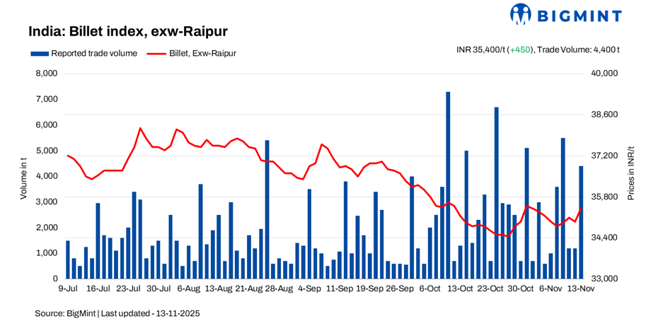 BigMint’s billet index surged by INR 450/t d-o-d, settling at INR 35,400/t exw-Raipur on 13 November 2025. News of the imposition of an anti-dumping duty on hot-rolled flat steel imports from Vietnam supported spot offers, resulting in moderate bookings in the semi-finished and finished steel segments throughout the day.