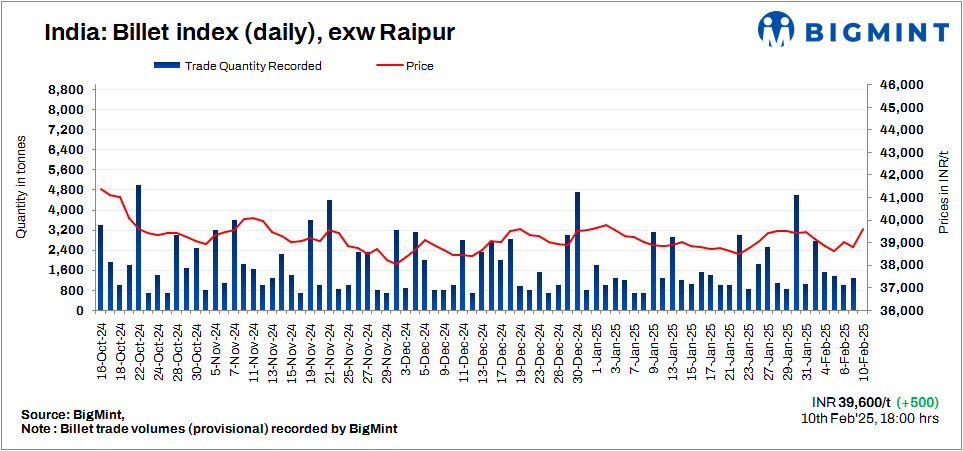 BigMint’s billet index increased by INR 500/tonne (t) d-o-d to INR 39,600/t exw-Raipur on 10 February 2025.