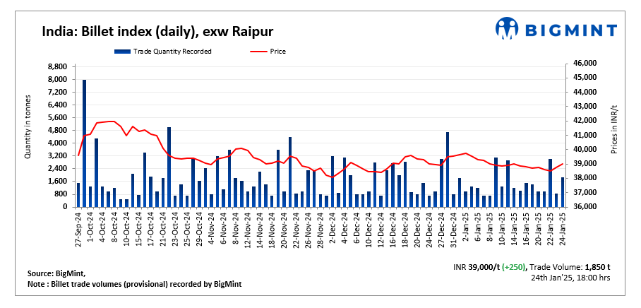 BigMint’s billet index increased further by INR 250/tonne (t) d-o-d to INR 39,000/t exw-Raipur on 24 January 2025.