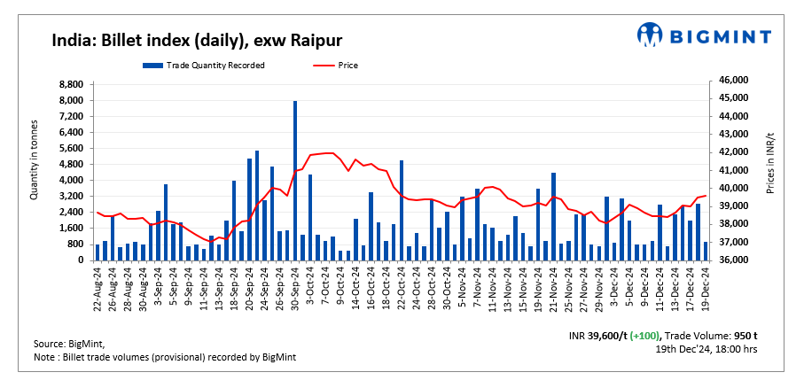 BigMint’s billet index increased further by INR 100/tonne (t) d-o-d to INR 39,600/t exw-Raipur on 19 December 2024.
