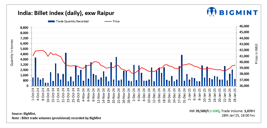 BigMint’s billet index increased further by INR 100/tonne (t) d-o-d to INR 39,500/t exw-Raipur on 28 January 2025. Notably, the index has seen an uptrend since 27 January.