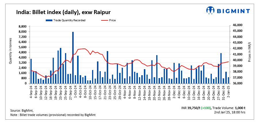 BigMint’s billet index rose by INR 100/tonne (t) d-o-d to INR 39,750/t exw Raipur on 2 January 2025.