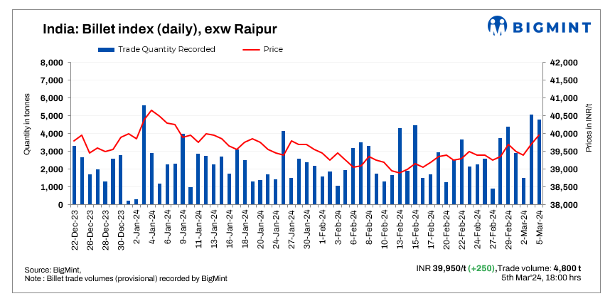 BigMint’s billet index improved another INR 250/t today, settling at INR 39,950/t exw-Raipur on 5 March, 2024.